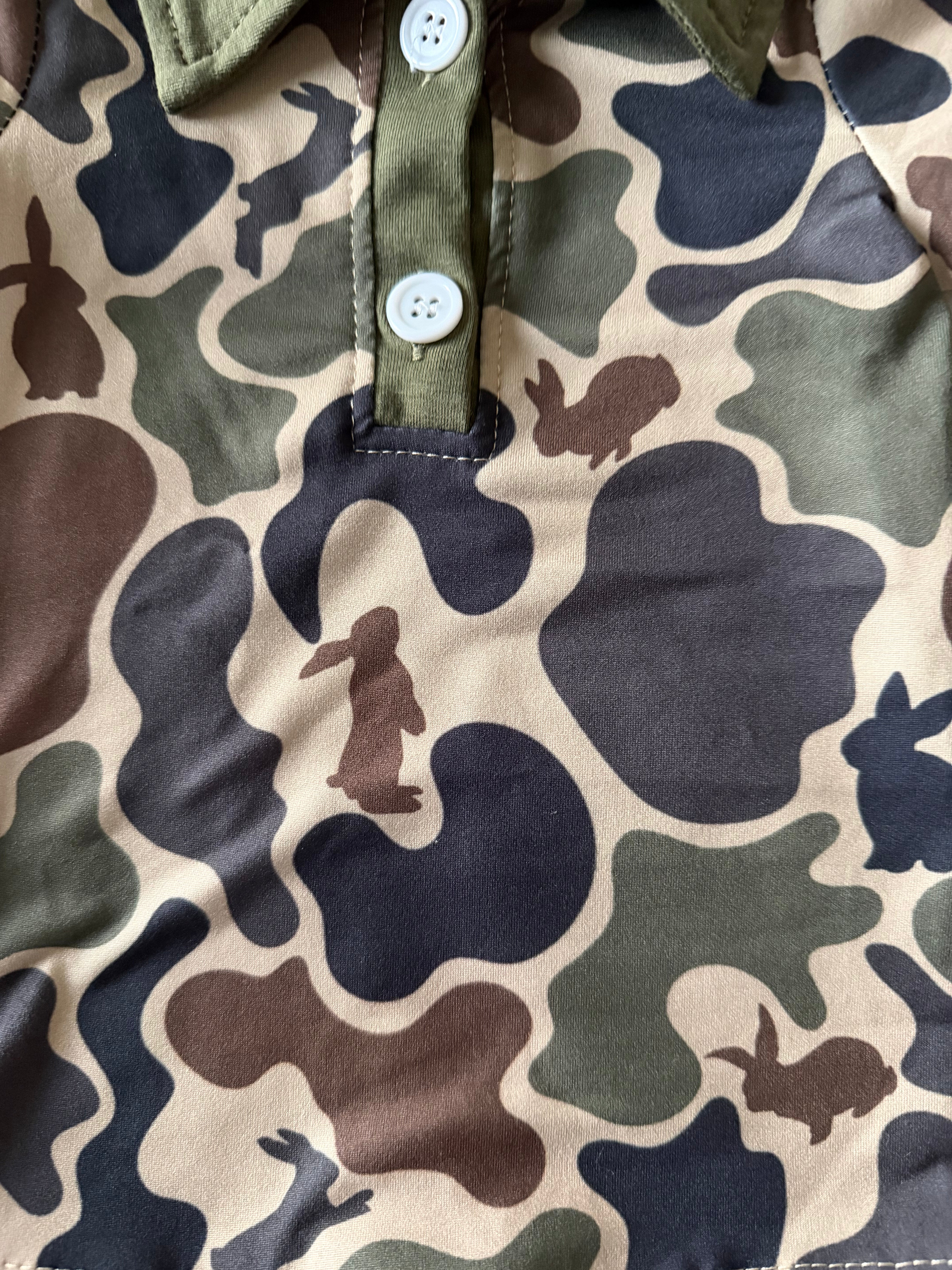 Your little cowboy will be ready for the Easter egg hunt in this Bunny Hunt Polo! This playful twist on classic camo hides adorable bunny silhouettes throughout the print — perfect for springtime adventures, family photos, and Sunday best. Made from soft, breathable cotton, this Western-inspired polo keeps your little one comfortable from the ranch to the egg hunt.