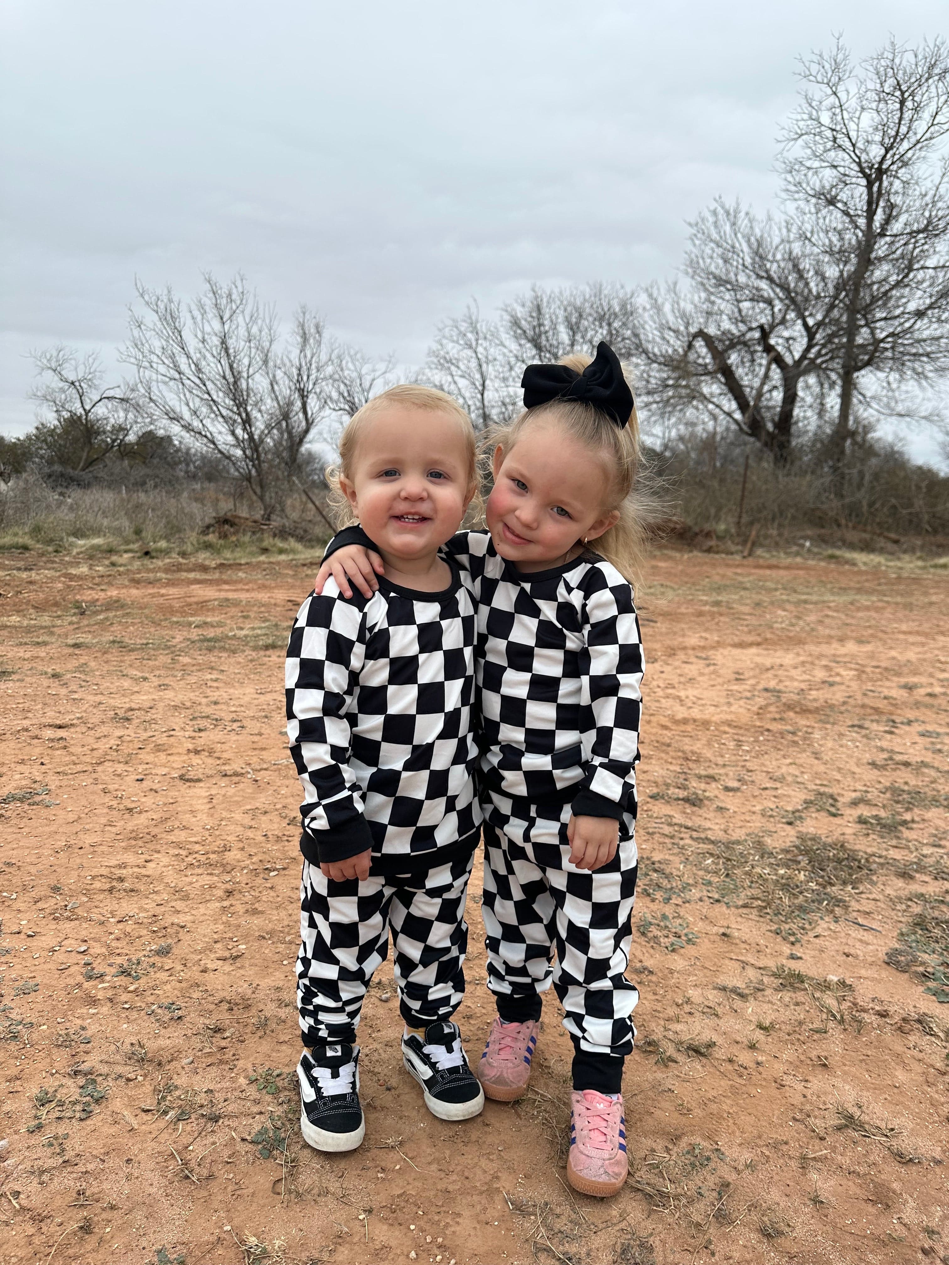 Our Checkered Jogger Set is the perfect blend of comfort and cool. Featuring a bold black and white checkered pattern, this two-piece outfit is soft, stretchy, and made for all-day play. Whether they're racing around the ranch or relaxing at home, this set brings standout style to every little adventure.