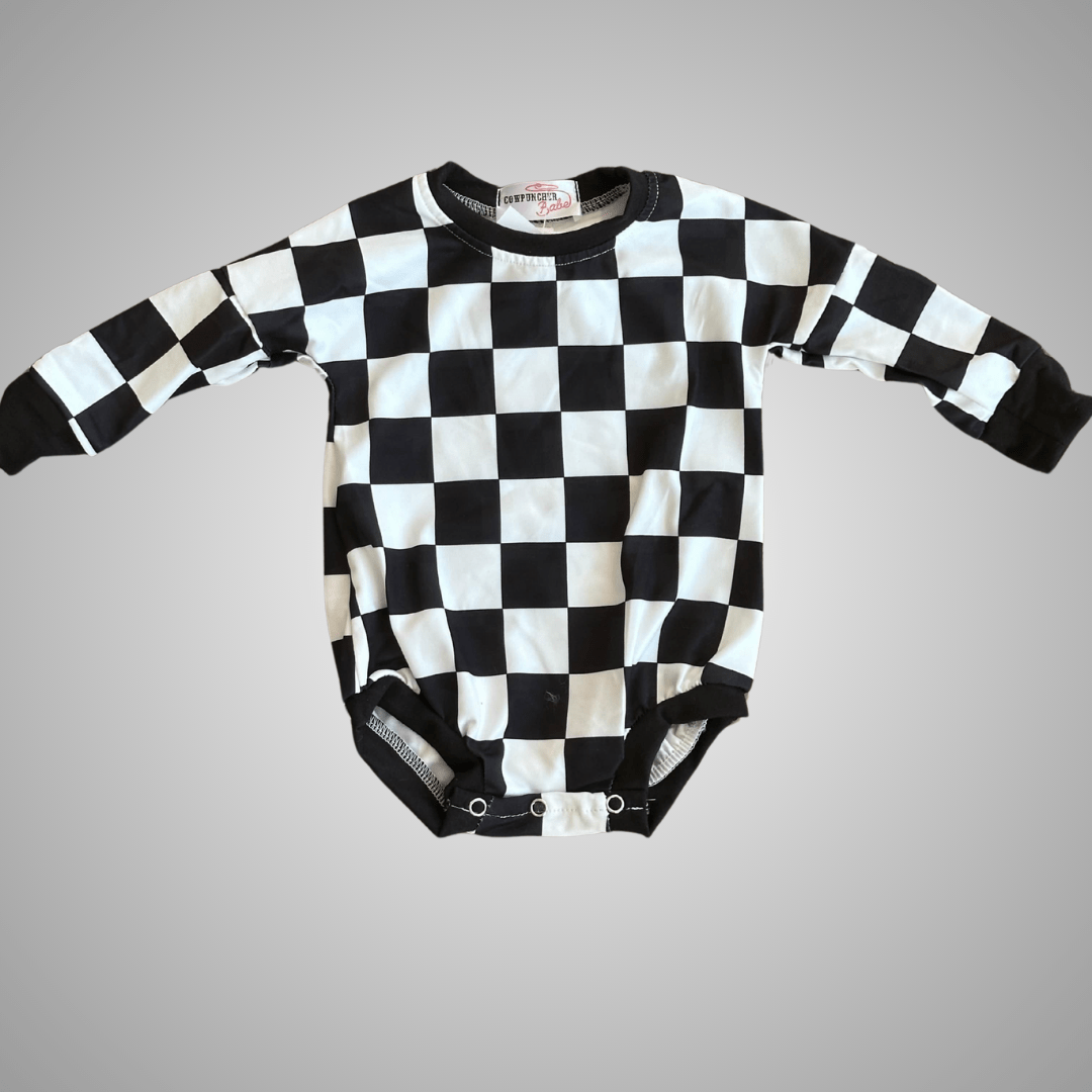 Start your engines! 🏁 Our Checkered Bubble Romper is the ultimate pick for little speedsters. Featuring a bold black and white checkered print with long sleeves and comfy bubble fit, this romper is as playful as it is practical. Snaps at the bottom make changes quick and easy, while the stretchy fabric keeps your little one comfy all day long. Perfect for race day, photos, or everyday fun!