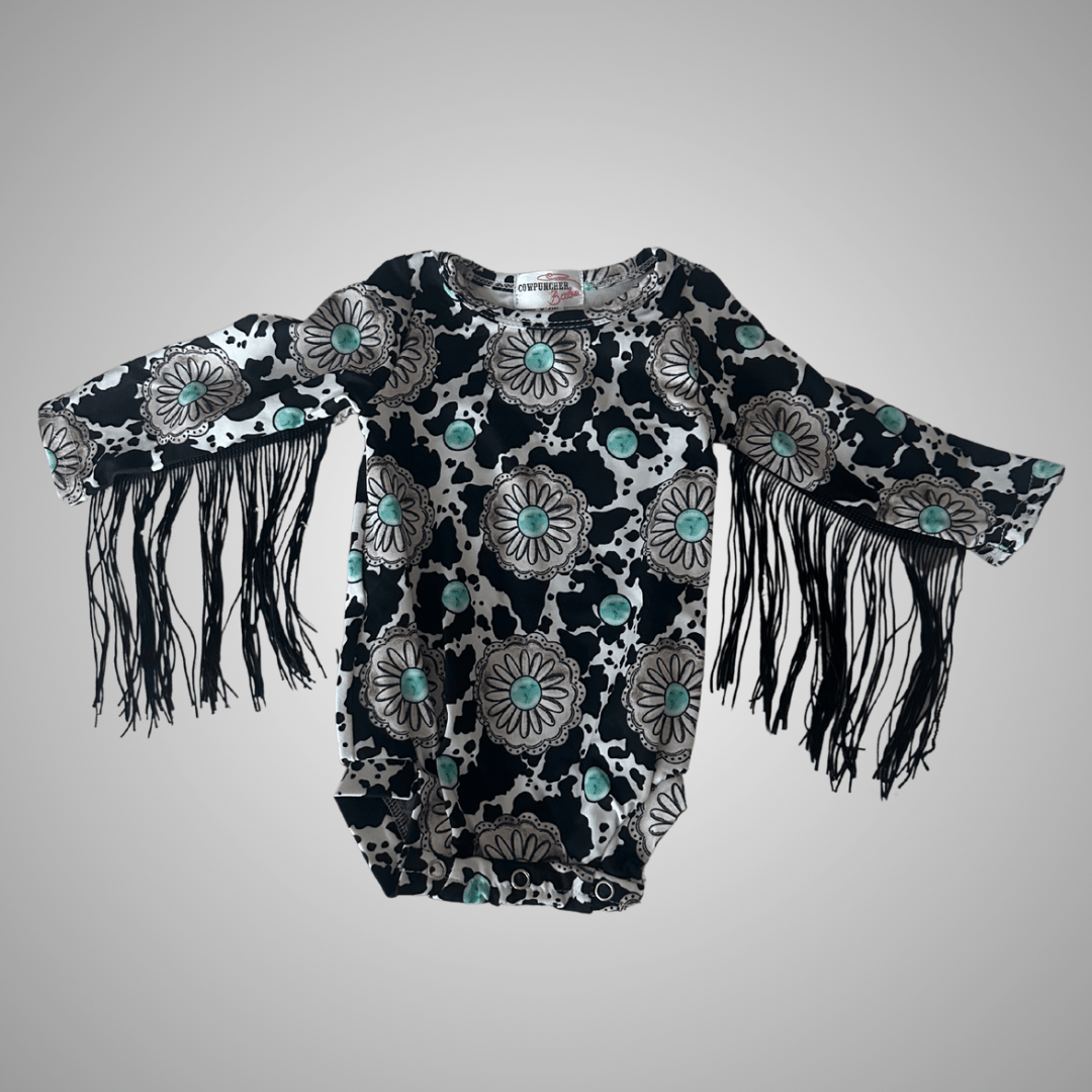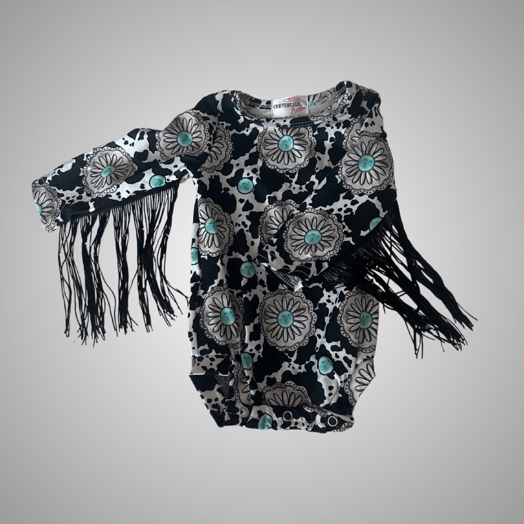A wild and stylish romper for your little rodeo star! This long-sleeve piece features a bold black-and-white cow print with turquoise concho-inspired florals and fun fringe detailing down the sleeves. Snaps at the bottom make for easy diaper changes, and the stretchy fabric keeps your cowgirl comfy all day. Perfect for western-themed events, rodeos, or everyday sass!