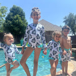 Get your little cowgirl ready for summer with this Western-inspired girls' swimsuit, featuring a unique cow ear tag and turquoise concho pattern. Designed for both style and comfort, this ranch-style swimwear is perfect for beach days, poolside fun, and rodeo adventures.