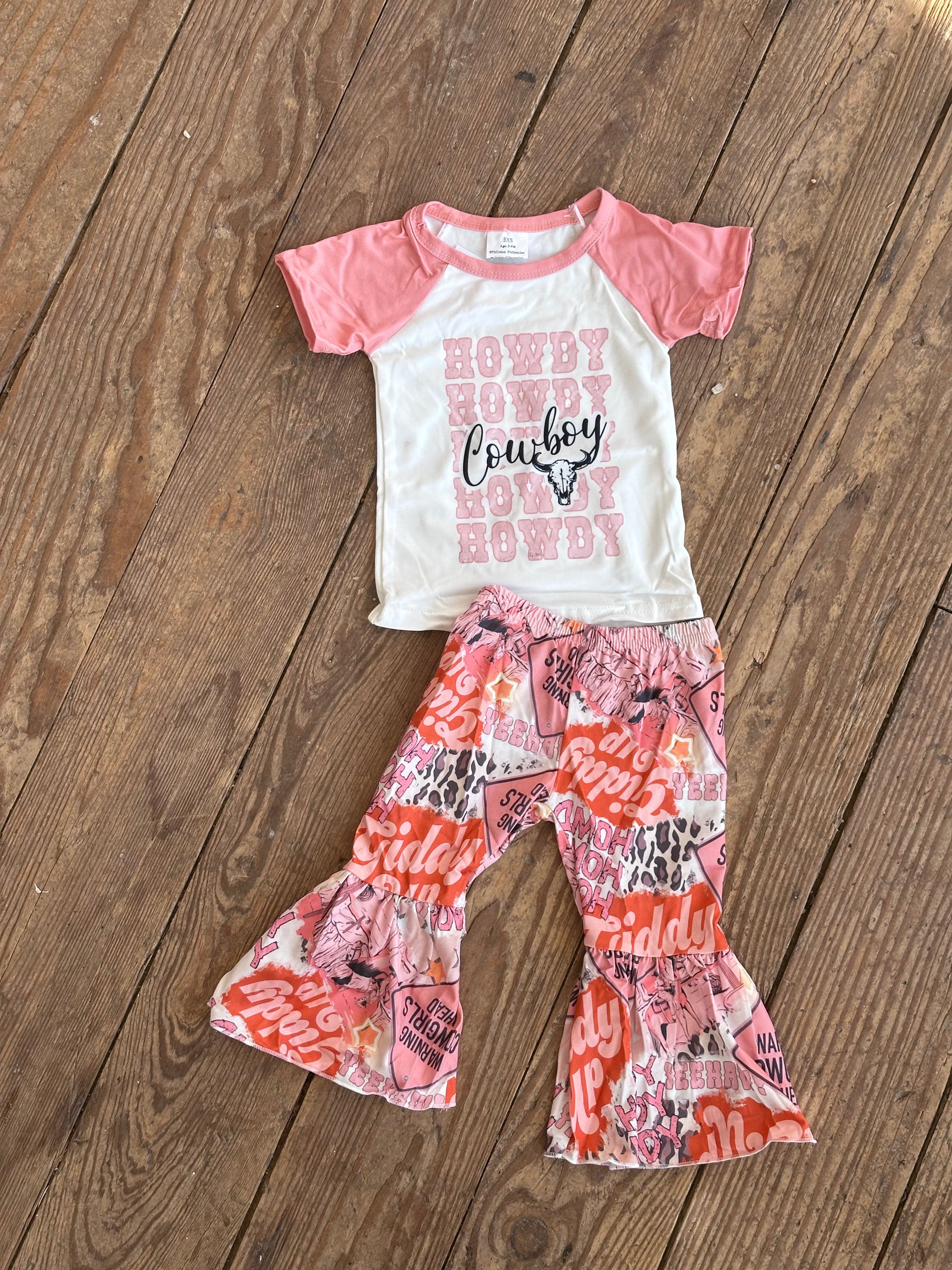 Cowgirl Crossing two piece set is perfect for all our western babes. The top has the Howdy multiple times with Cowboy written across. the pants are fun and have western writing all over. The pants are elastic waist and bell bottoms.