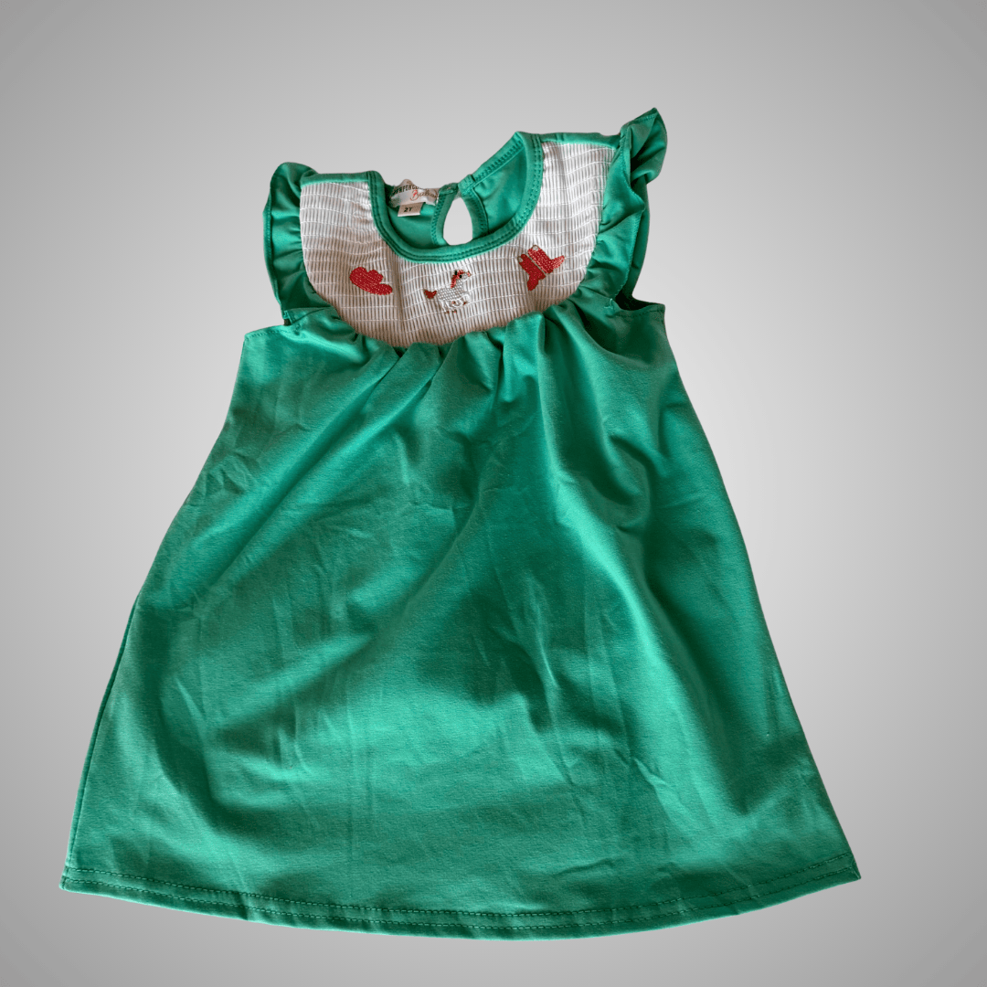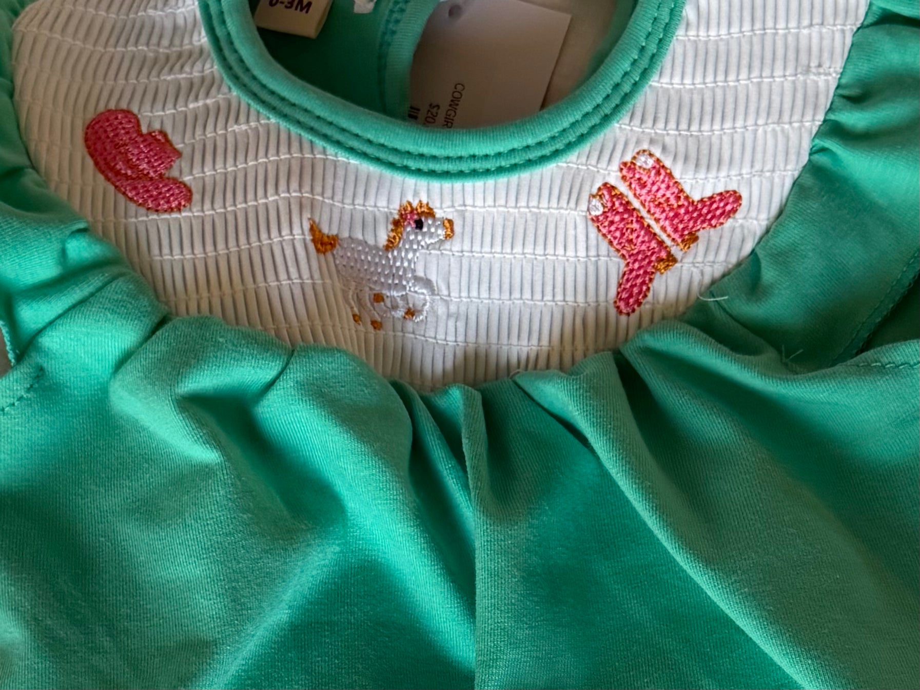 Saddle up in style with our Cowgirl Cutie Smocked Dress! This light green beauty features hand-smocked pink boots, hats, and a sweet pony across the yoke — the perfect mix of Western charm and southern sweetness. Flutter sleeves and a soft cotton blend make it ideal for spring photos, rodeo days, or Sunday mornings.
