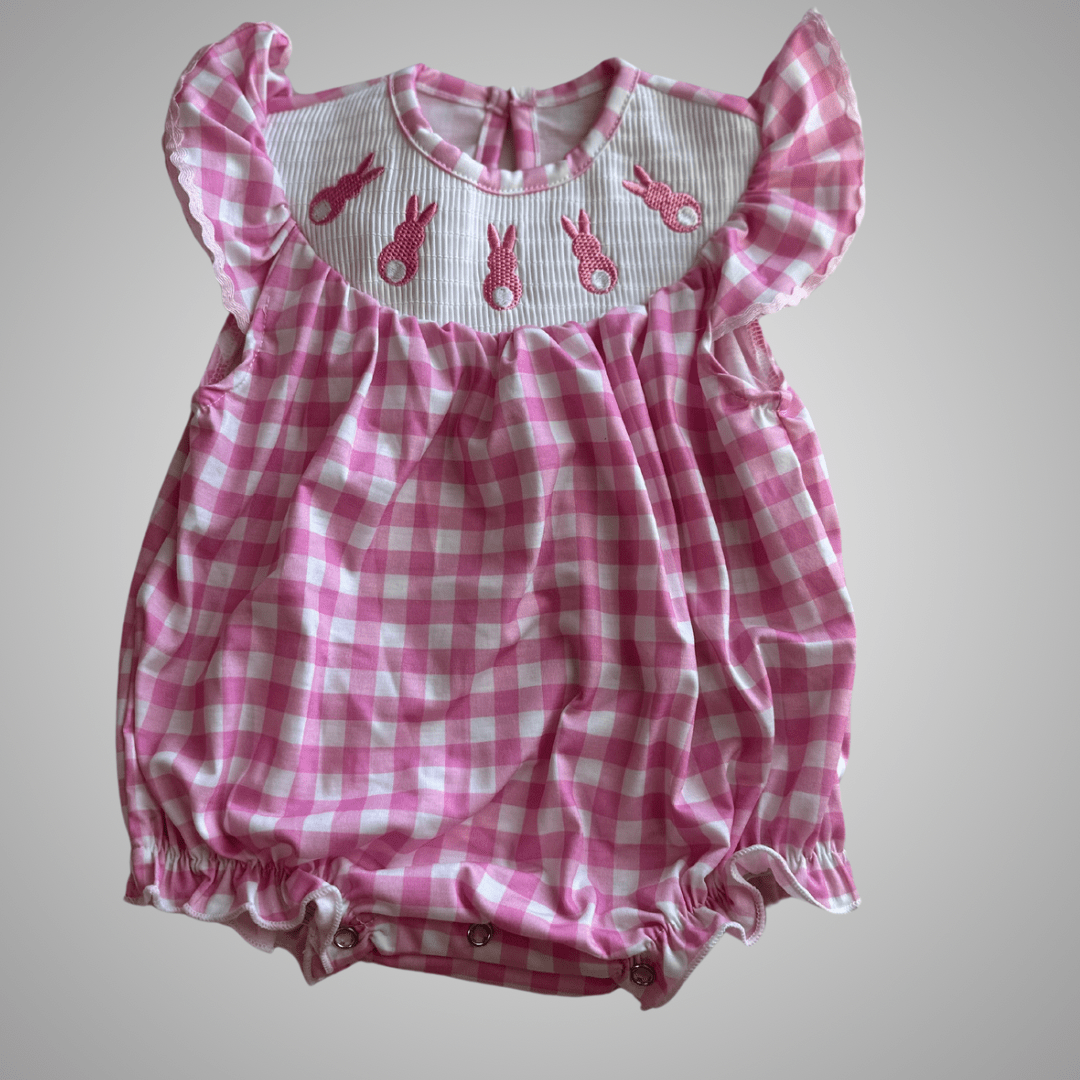 Dress your little one in adorable charm with this pink gingham baby romper. Featuring a classic checkered pattern, this romper is designed with soft, breathable fabric to keep your baby comfortable all day long. The delicate smocked yoke showcases intricate embroidered bunny details, adding a sweet and playful touch. Ruffled flutter sleeves and elasticized leg openings provide a cozy fit, while the snap closures at the bottom ensure easy diaper changes. Perfect for Easter, special occasions, or everyday wear, this romper combines style and practicality for your baby’s wardrobe.