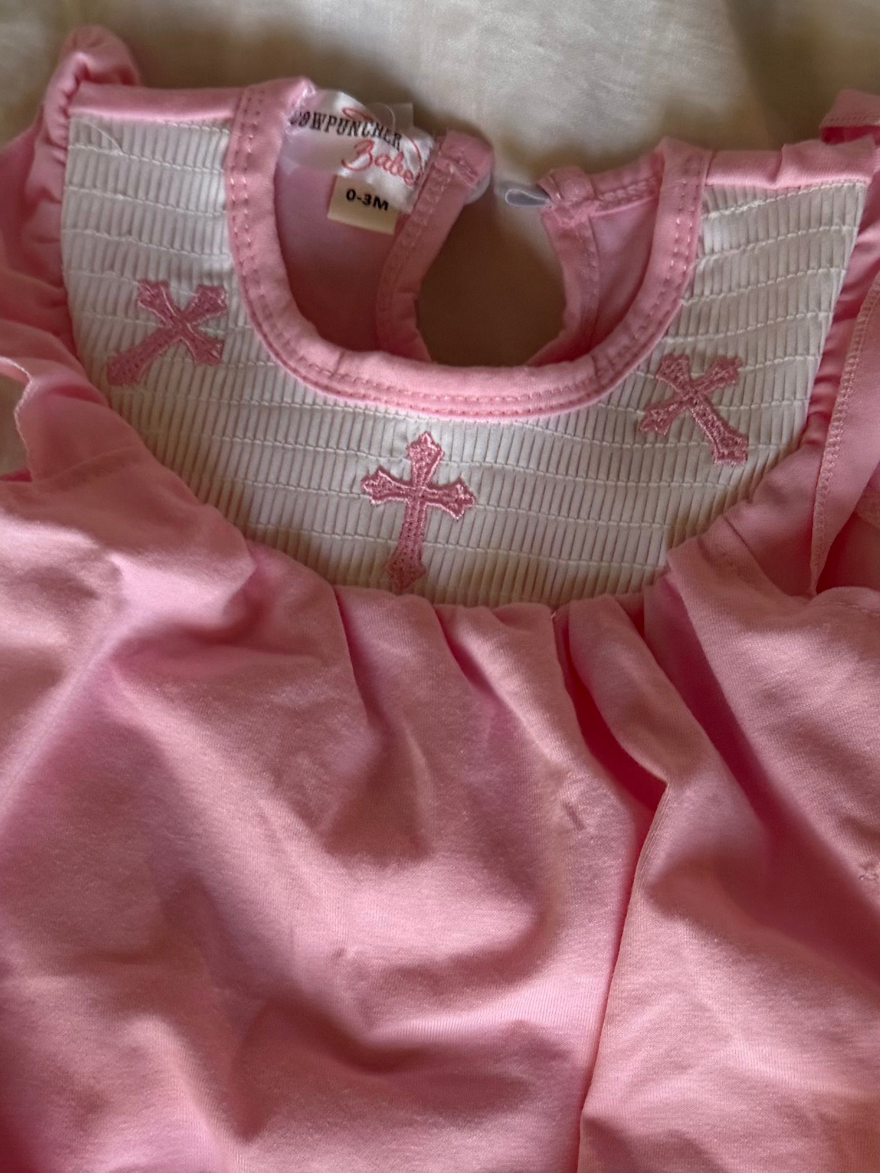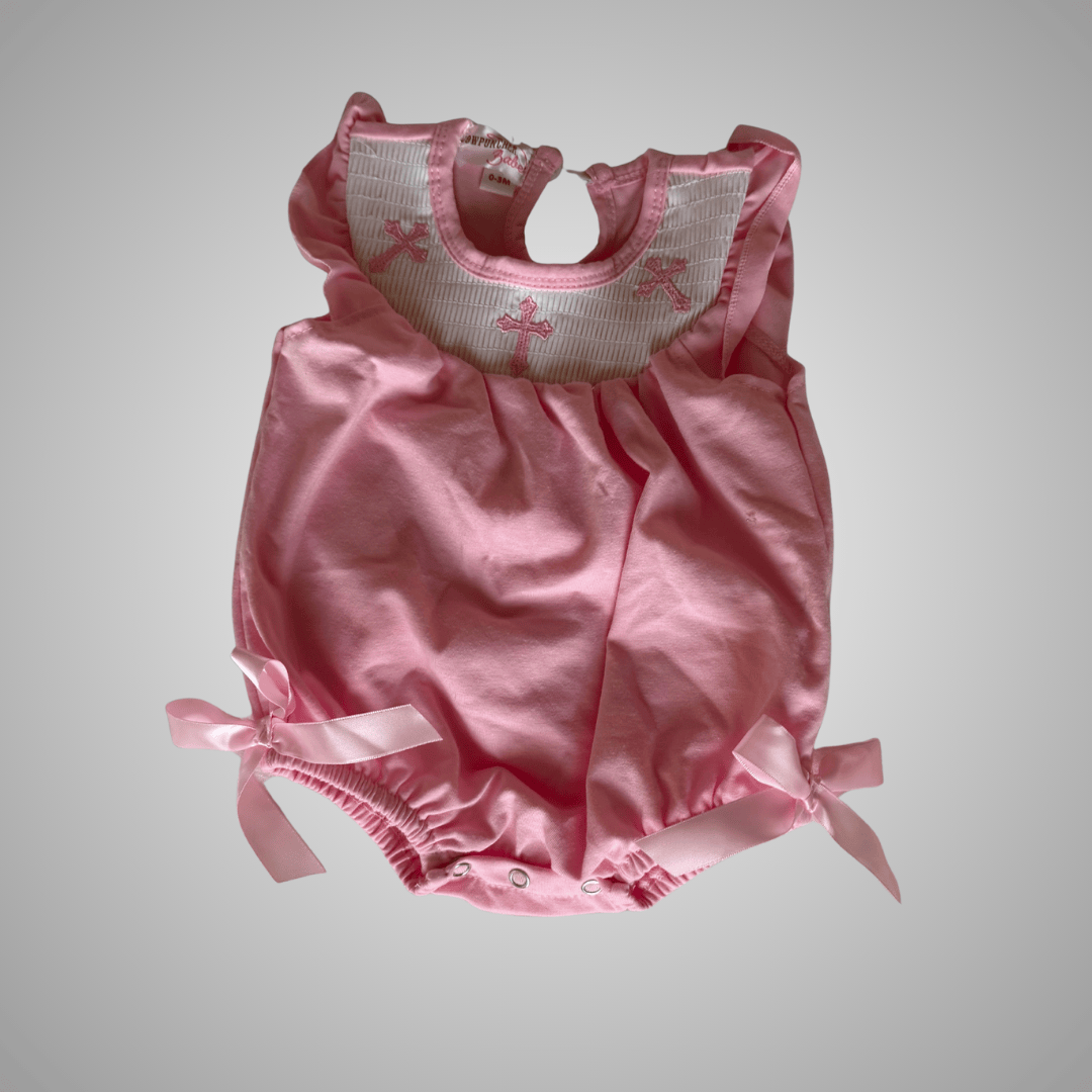 Celebrate Easter in the sweetest way with our Faith & Frills Smocked Collection! Available in both a classic bubble romper and a darling dress, each piece features hand-smocked pink crosses on a crisp white neckline, flutter sleeves, and soft pastel pink cotton that’s perfect for springtime photos and Sunday bests.