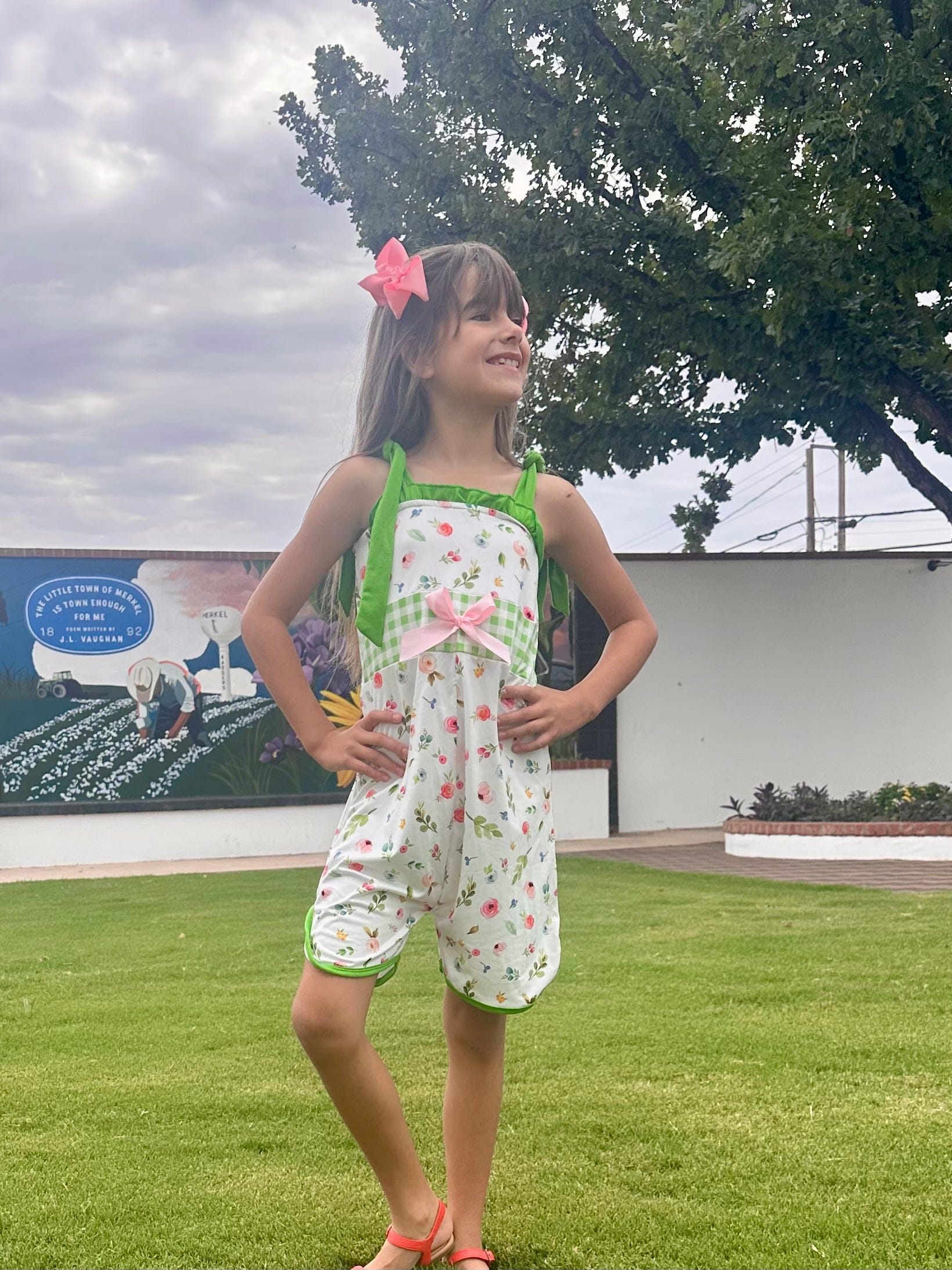 Sweeten up your little one’s wardrobe with our Garden Blooms Bow Romper! This charming piece features a soft floral print sprinkled with pastel blooms, bright green bow-tie shoulder straps, and a darling pink satin bow for the perfect spring touch. Finished with a green gingham accent and trim, it’s the ultimate romper for sunny days, picnics, and Easter photos. Made from buttery-soft, breathable fabric for all-day comfort and play.