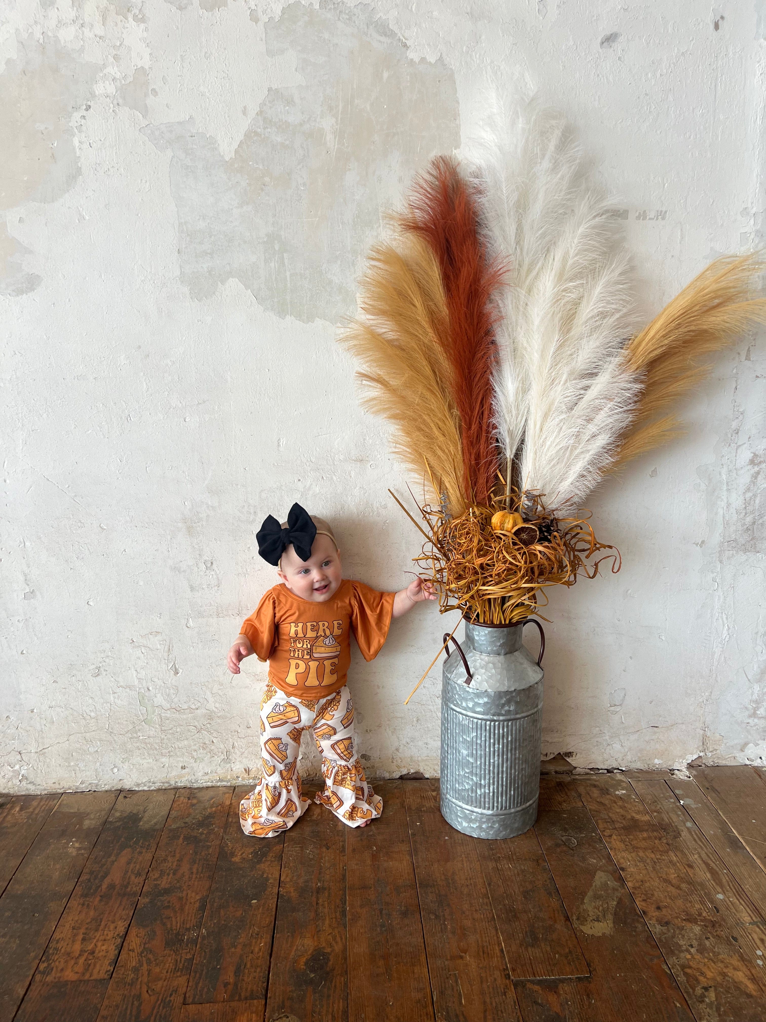 Serve up some sweet fall style with our Here for the Pie outfit! Featuring a burnt orange bell-sleeve top with a playful pie graphic, this set is paired with matching flared pants covered in slices of pie and festive lettering. Perfect for Thanksgiving gatherings, family dinners, and little ones who are just here for the dessert!