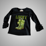Celebrate St. Patrick’s Day in style with this Lucky Girl black long sleeve shirt! Featuring a vintage Western-inspired design with green cowboy boots, shamrocks, and a stylish bow, this festive tee is perfect for Irish celebrations, parades, and parties. Made from soft, comfortable fabric, this St. Paddy’s Day shirt is great for layering or wearing on its own. Whether you're out for some St. Patrick’s Day fun or embracing your lucky Irish spirit, this trendy long sleeve tee is a must-have!