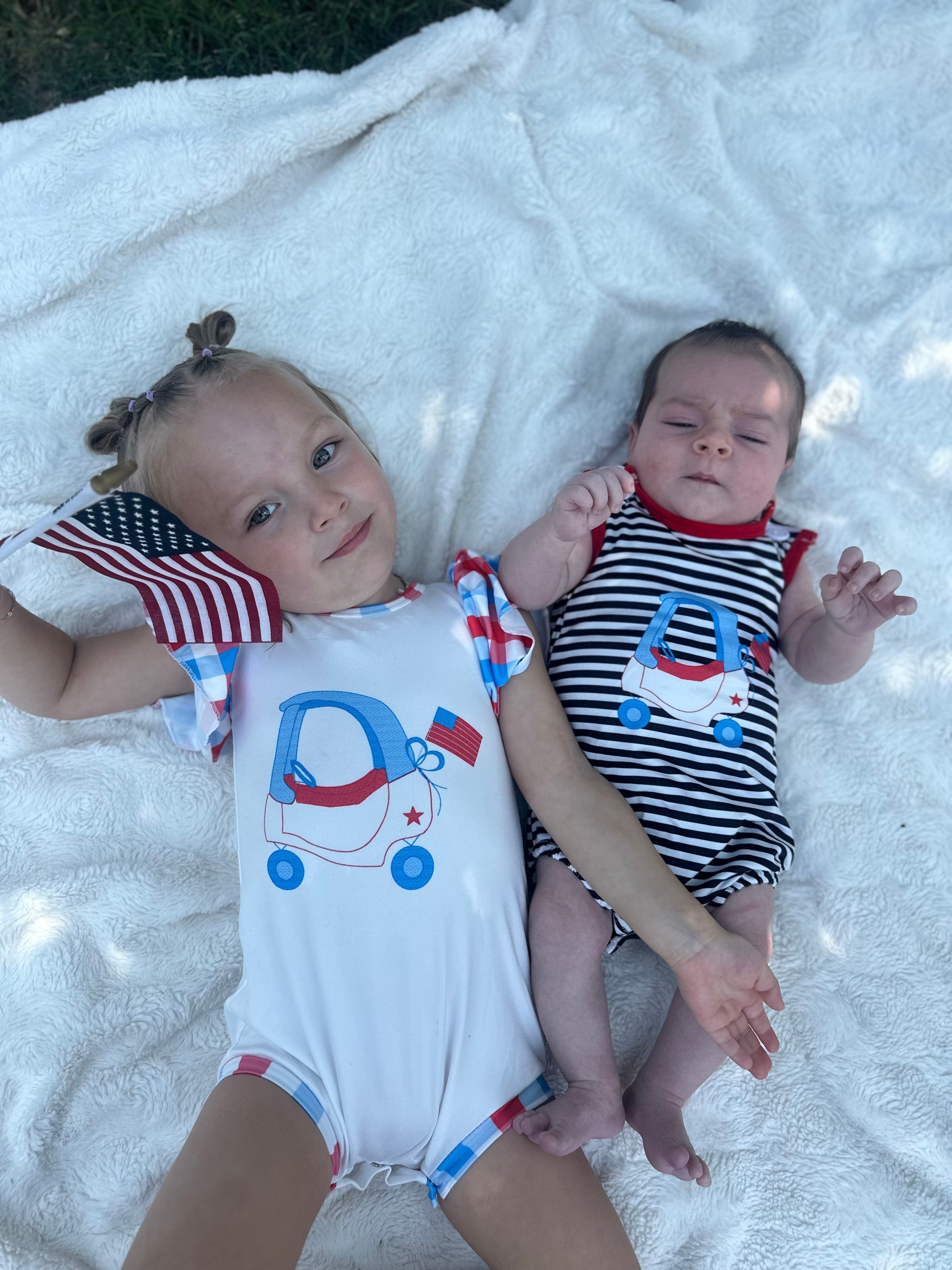 This charming boy’s romper features bold black and white stripes, offering a timeless look. The front is decorated with a playful little car, complete with an American flag design, making it the ideal choice for patriotic celebrations or casual wear.