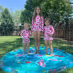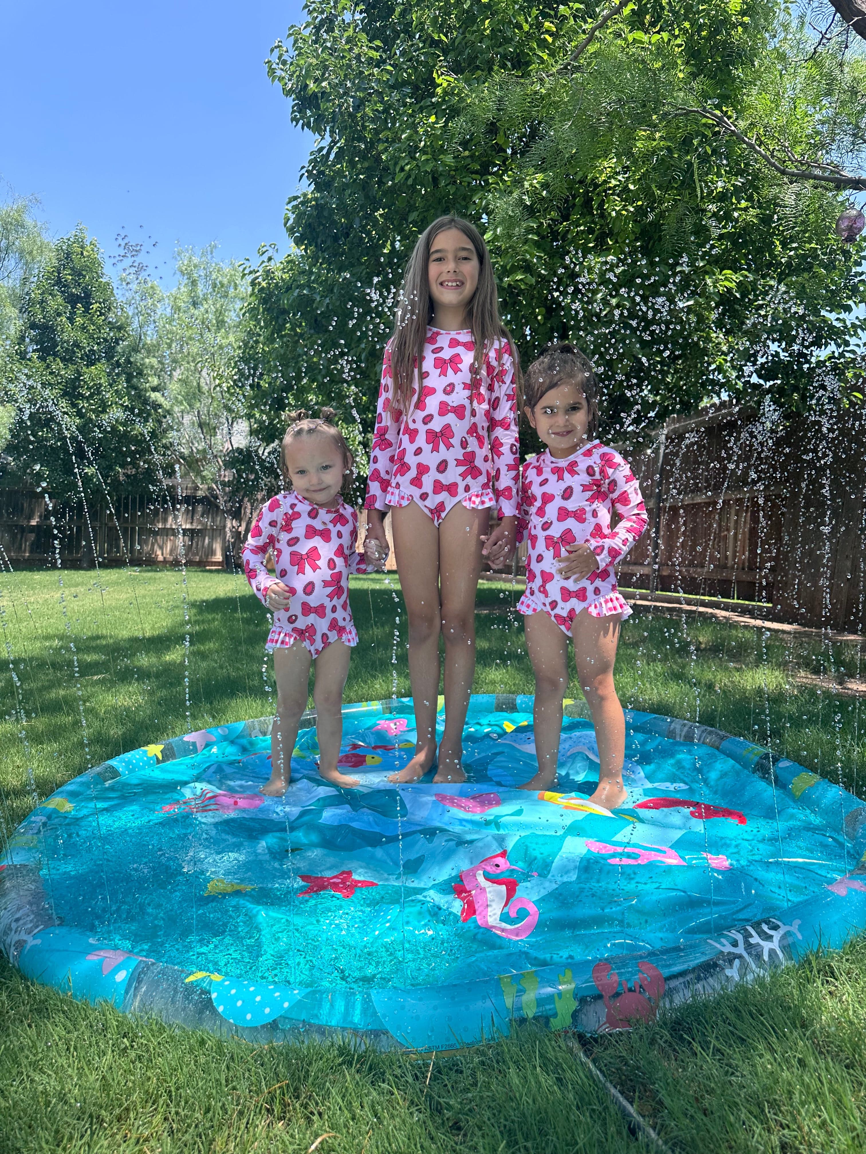 This adorable long-sleeve swimsuit features a charming pink base adorned with vibrant pink bows and decorative oval details, making it a stylish and playful choice for little swimmers. The ruffled hem with pink and white gingham accents adds a touch of sweetness and extra flair. Designed for comfort and sun protection, this swimsuit ensures a fun and fashionable beach or pool day. Perfect for young fashionistas who love to make a statement while staying active in the water!