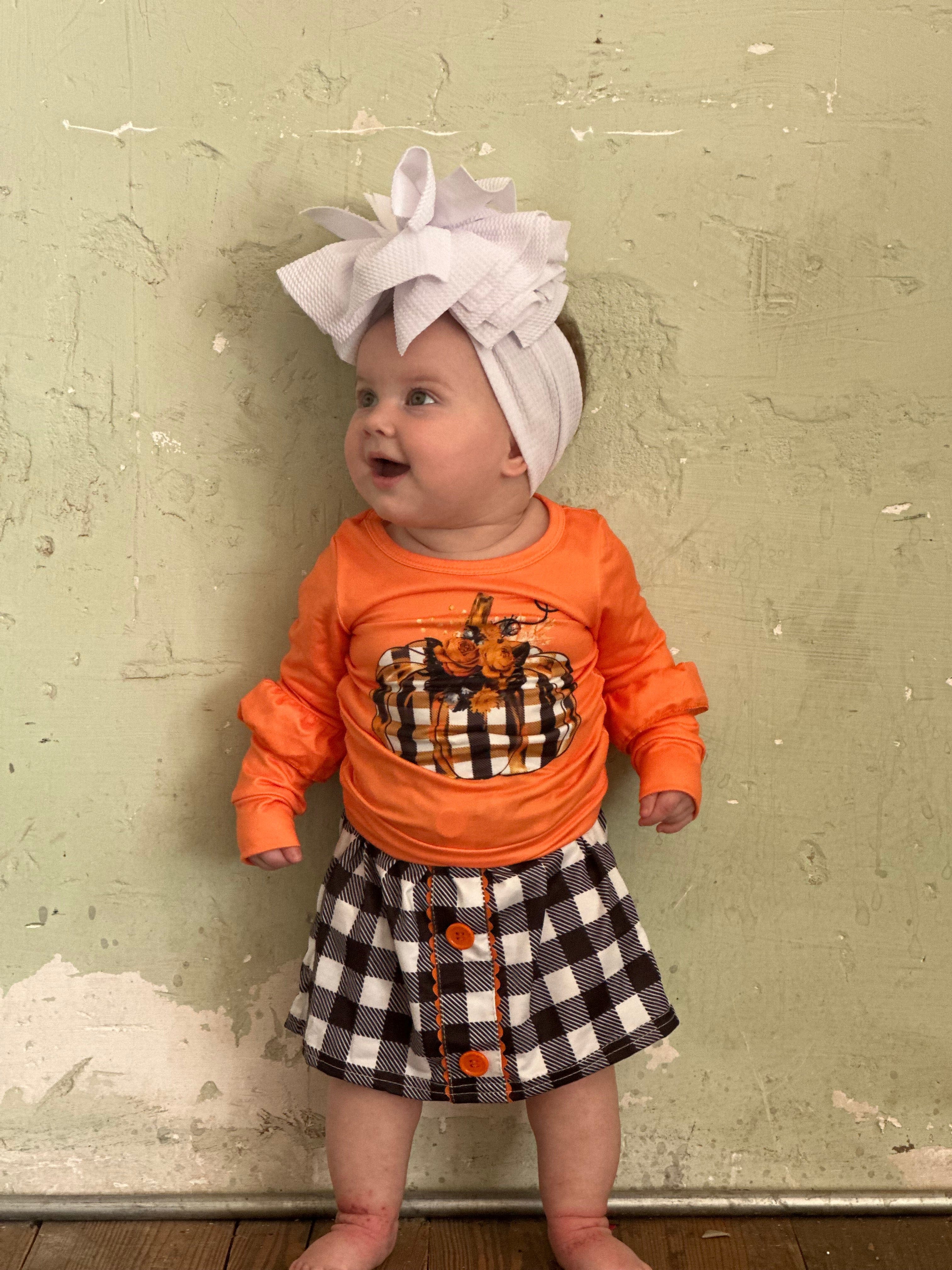 Get fall photo-ready with our Pumpkin Picnic set! This bright orange ruffle-sleeve top features a floral-accented buffalo plaid pumpkin that’s full of autumn charm. Paired with a coordinating black-and-white plaid skirt with decorative orange buttons, this outfit is a festive favorite for pumpkin patch visits, hayrides, and cozy fall days.