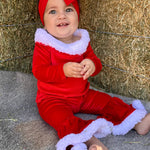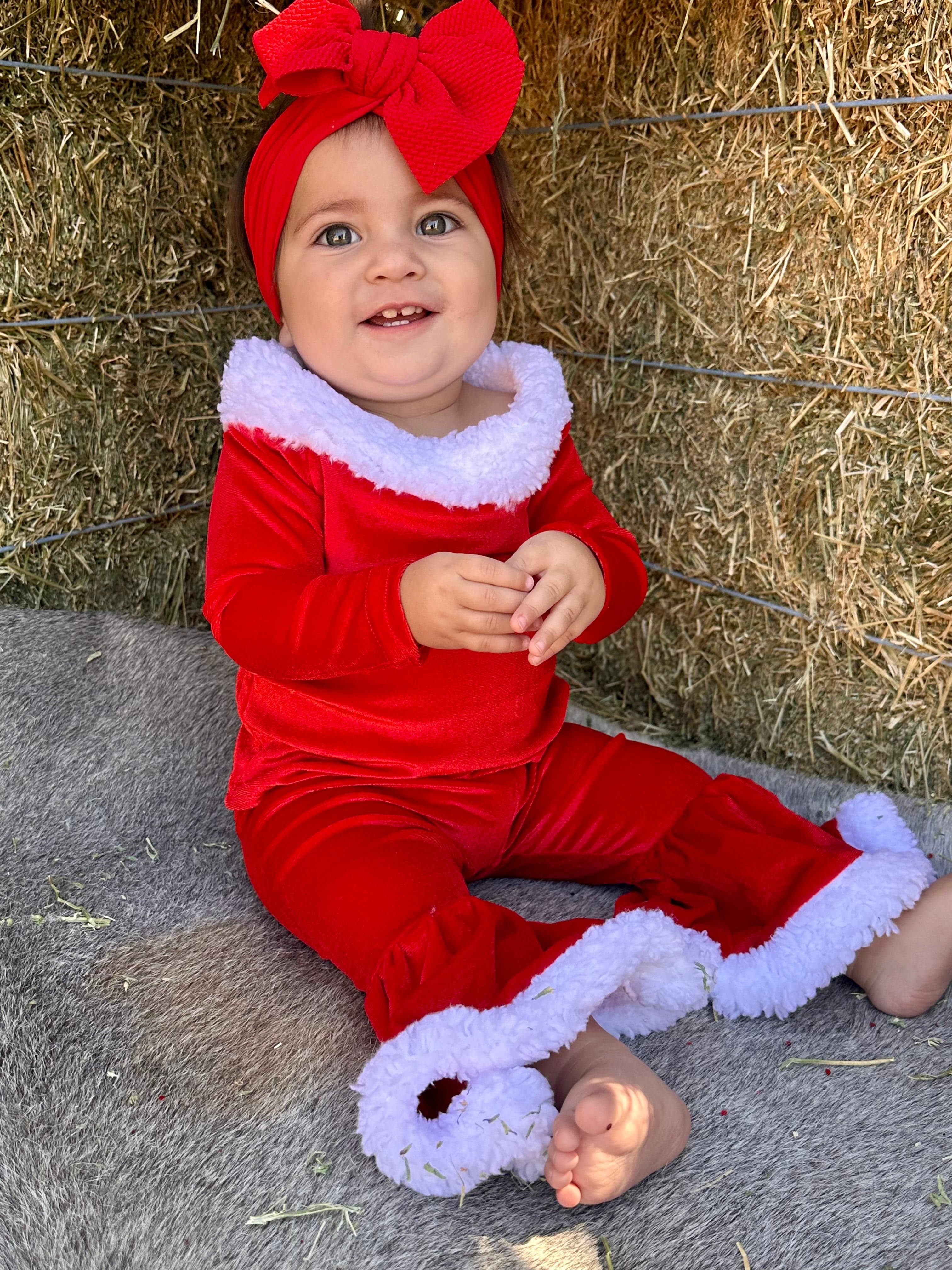 Get festive and fabulous with our Santa Babe Set! This adorable two-piece holiday outfit features a bright red off-shoulder top and matching bell-bottom pants trimmed in soft white faux fur. Perfect for Christmas photos, holiday parties, or spreading cheer in true cowgirl style all season long!