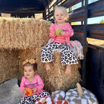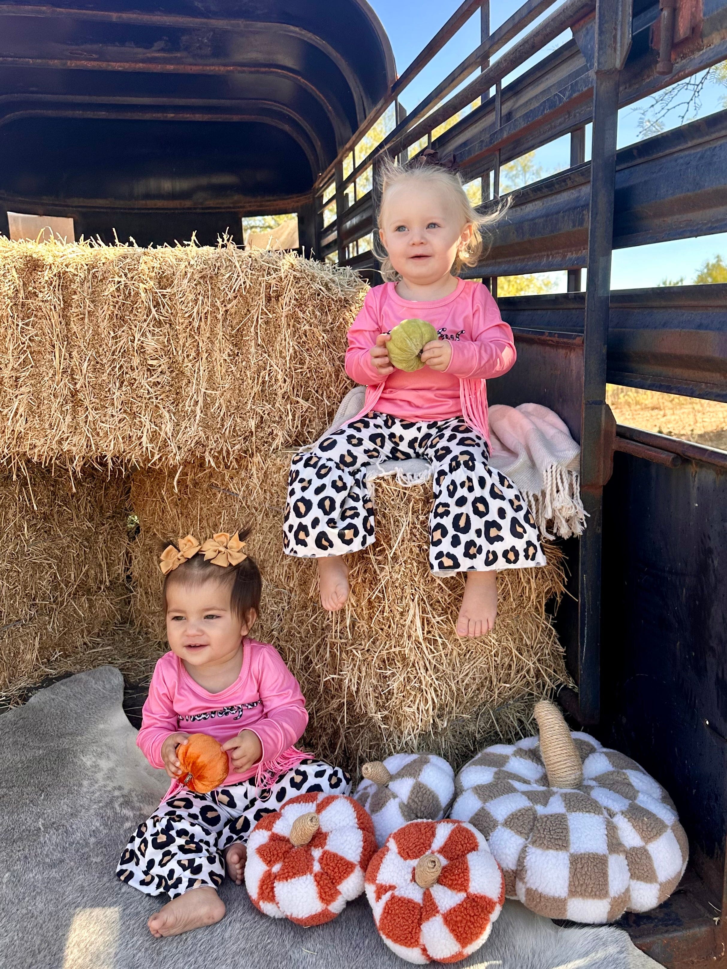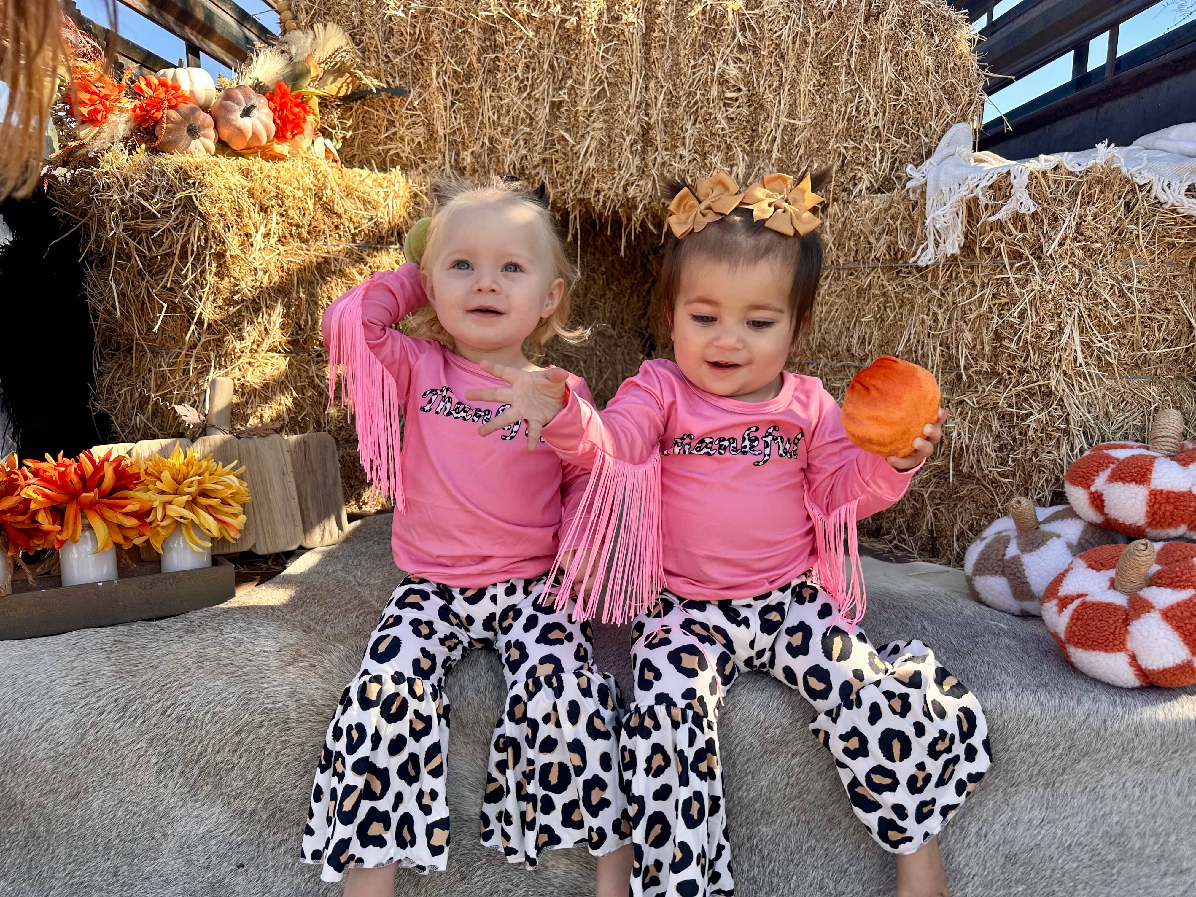 Celebrate her wild heart and grateful spirit with our Thankful & Wild Fringe Set! This adorable outfit features a dusty pink fringe long-sleeve top with a bold “Thankful” graphic, paired with flared cheetah print bell bottoms for the perfect mix of sweet and sassy. Ideal for fall festivities, Thanksgiving gatherings, or everyday western flair.