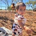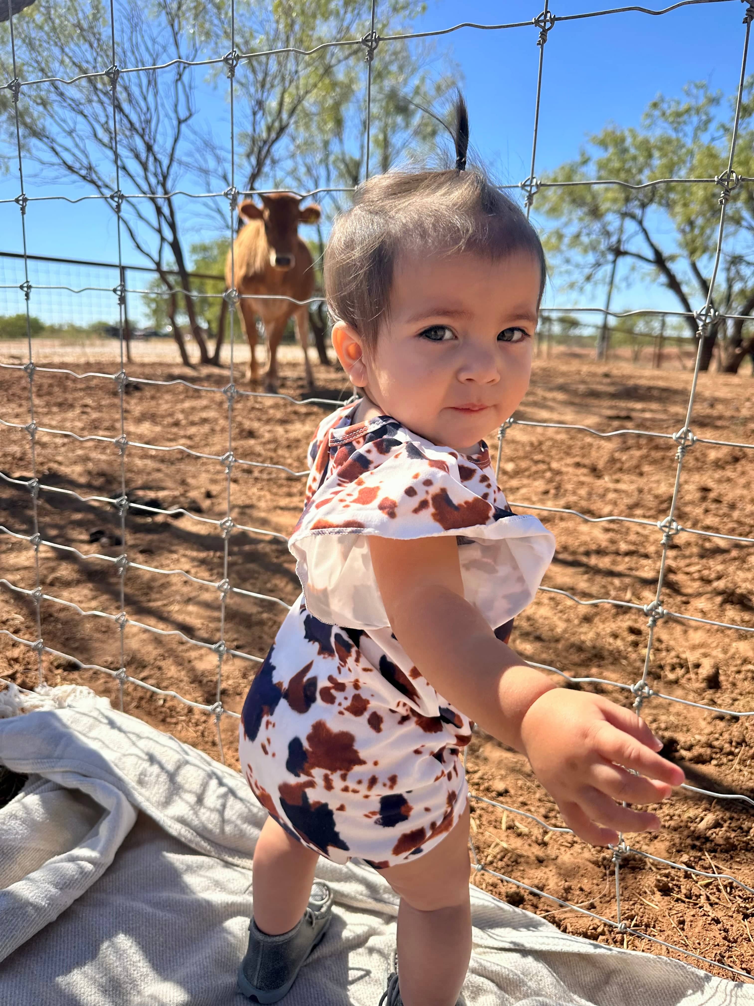 Add a bold western touch to her wardrobe with our Western Sunset Cow Print Romper! Featuring soft flutter ruffle sleeves and a striking cowhide-inspired pattern in warm rust, navy, and cream tones, this one-piece is perfect for little cowgirls who love to stand out. Soft, stretchy, and ready for rodeo days or playtime fun.
