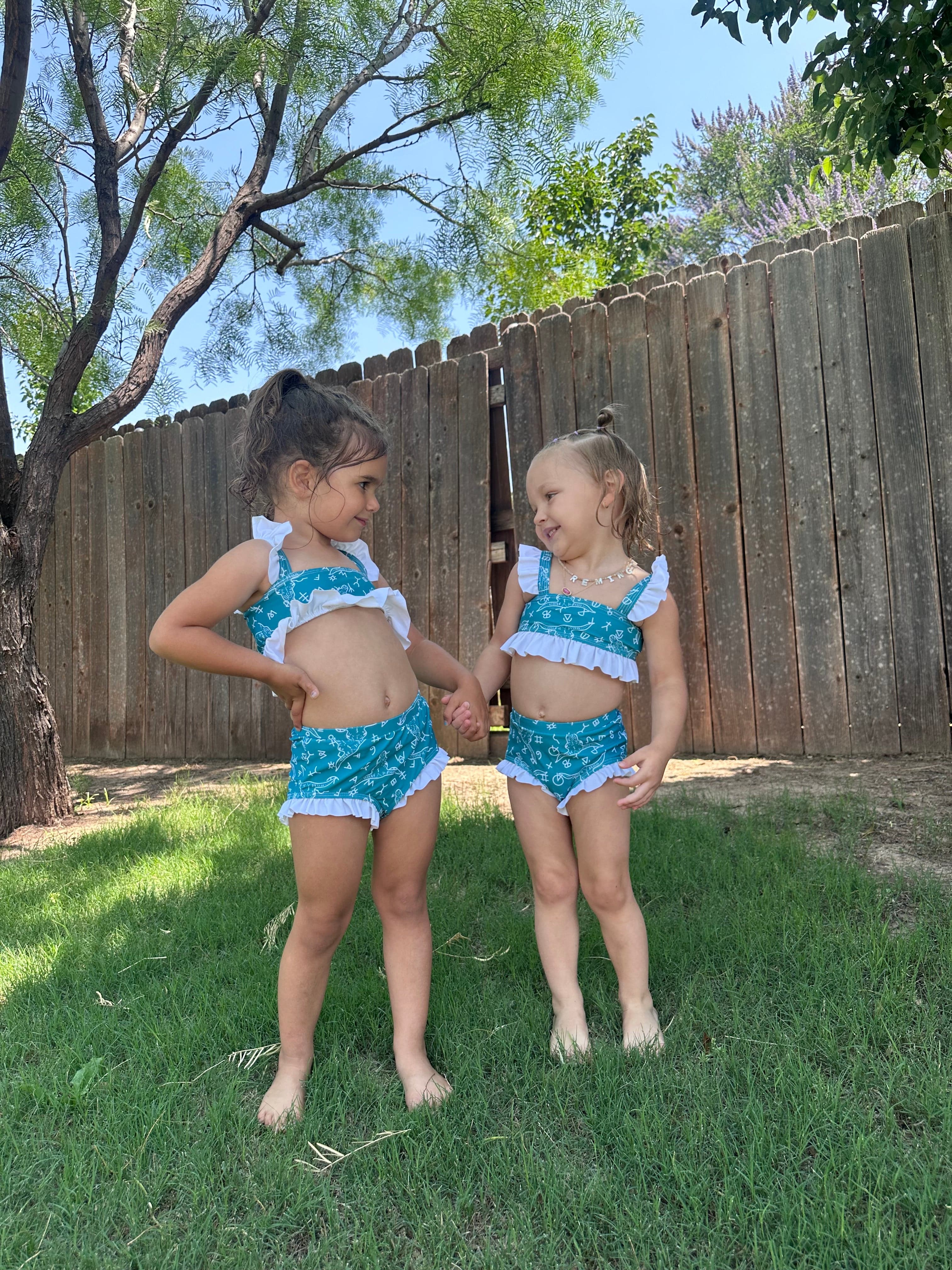 Saddle up for summer fun with the Wild West Wrangler Swimwear Collection! Featuring a turquoise cowboy-inspired print with vintage ranch brands, cowboy gear, and wild stallions, this Western swimwear is perfect for little adventurers who love horses, rodeos, and the great outdoors.