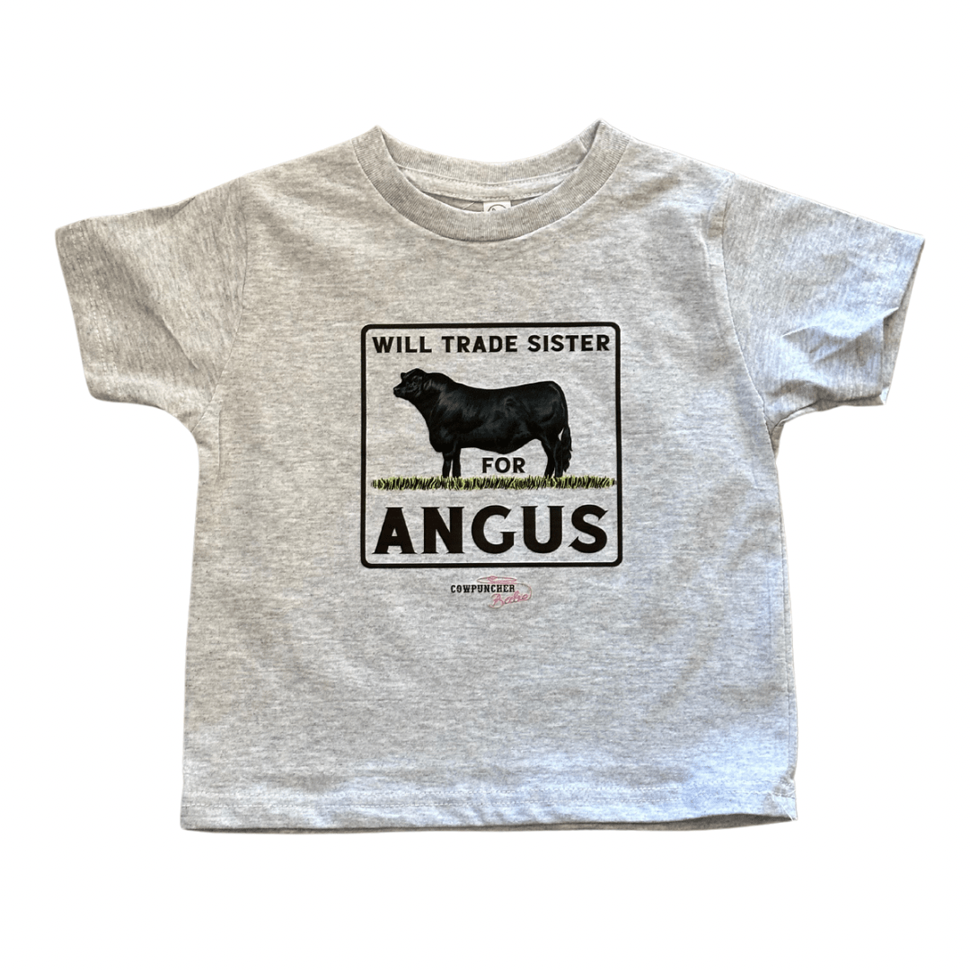 For the little cowboy with big cattle dreams, this playful graphic tee is sure to get laughs on the ranch. Featuring a bold black Angus silhouette and the cheeky phrase “Will Trade Sister for Angus,” this shirt adds a fun twist to farm life fashion. Made from a soft cotton blend in classic heather gray, it’s built for comfort, durability, and all-day play. Finished with the Cowpuncher Babe logo for an authentic Western touch.